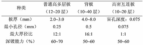 下表为某厂根据上述定义对PCB产品进行的分类及目前使用的电镀铜工艺的主要性能指标。