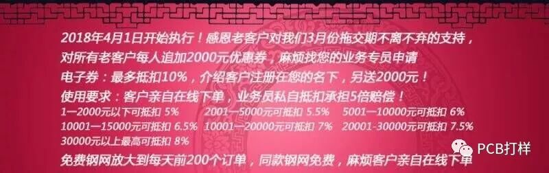 ,新客户注册送5000元,介绍客户送2000元一位,另送0.5%业绩分红,不会麻烦您,无需您跟单,享受优惠政策要麻烦您亲自下单,首次麻烦一点点,第二次就简单了,像订单查询,钢网资料,合同打印,价格透明,资料永存,无论谁走。是您的业务专员一并处理的。